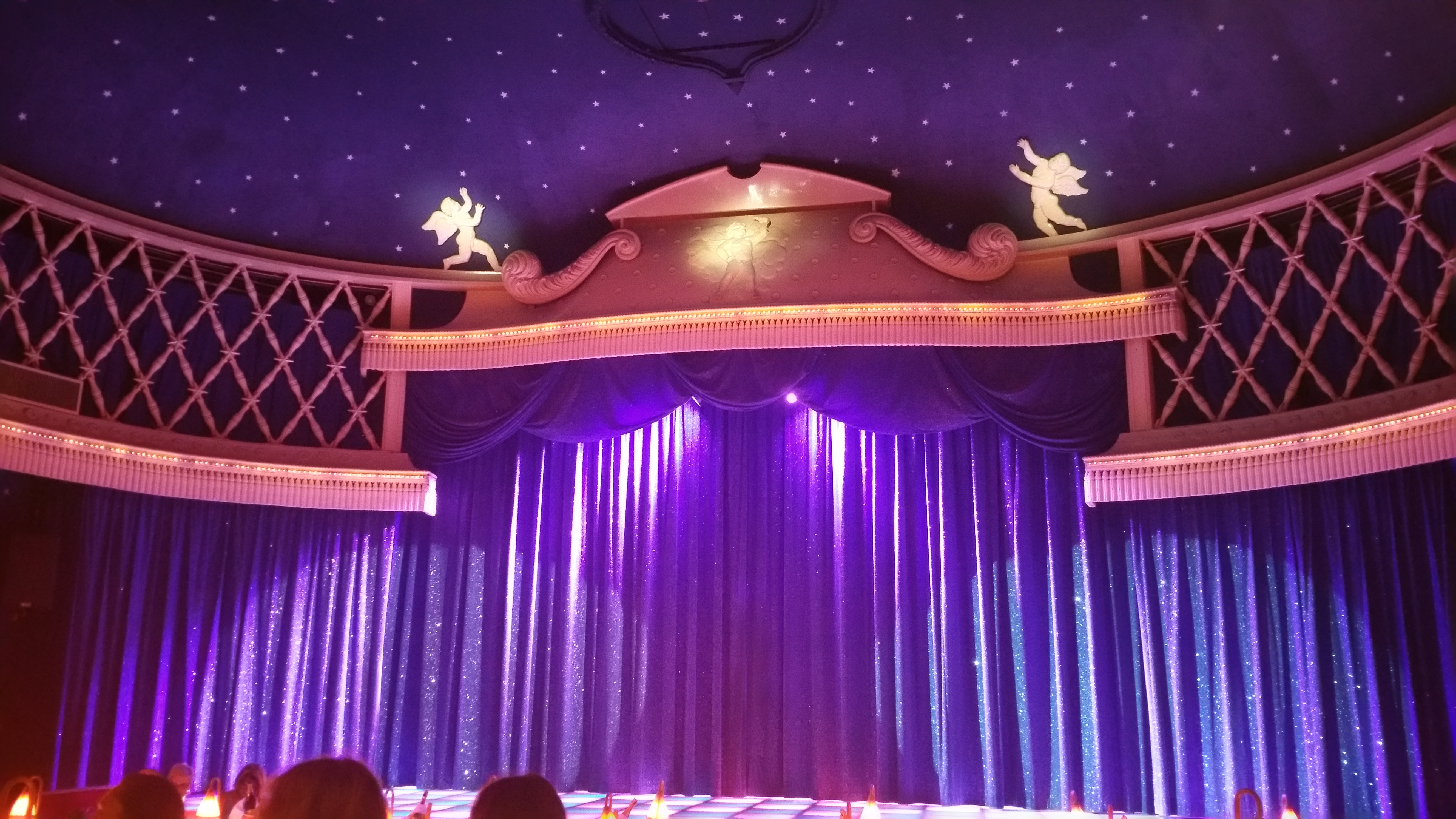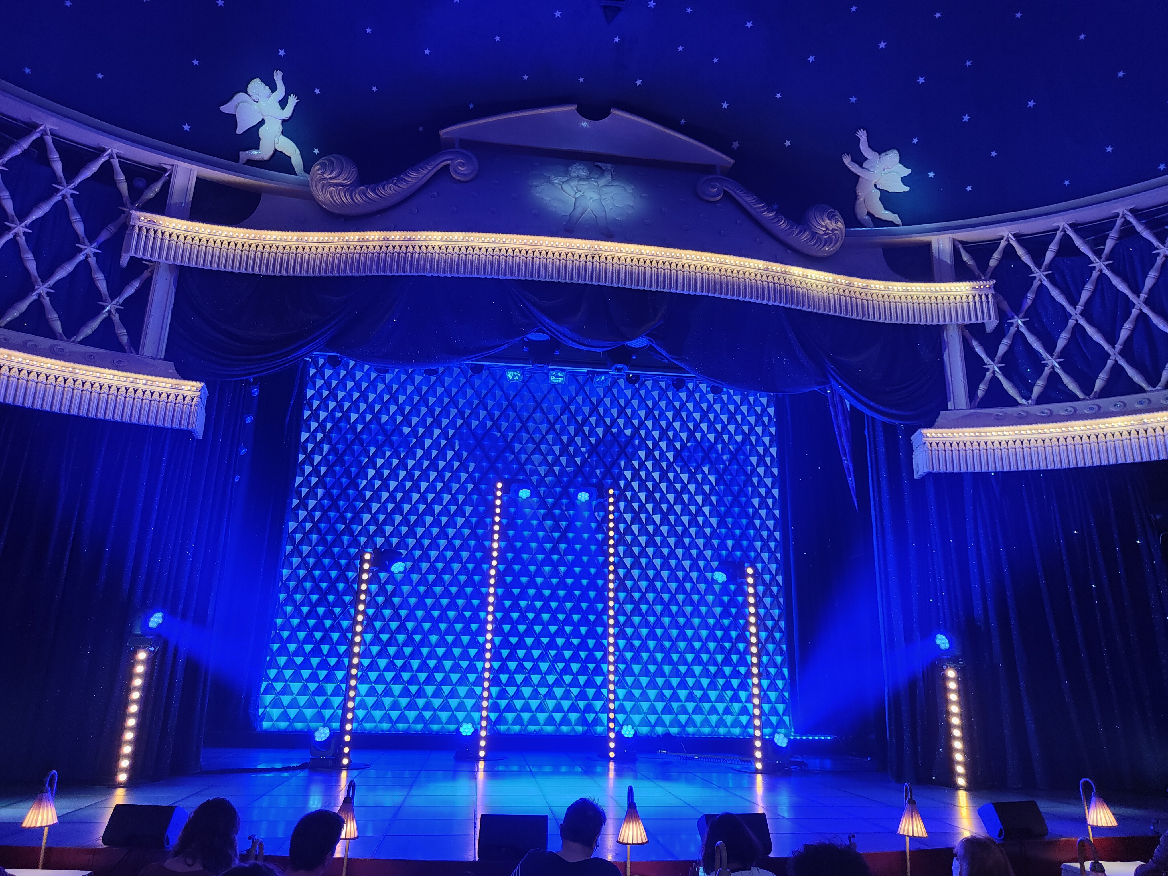 Belle salle assez grande, mais, cosy, intime, avec des petites lampes à chaque table, des anges au plafond et une voûte étoilée. La scène est assez grande. Le + : on peut consommer des boissons pendant le spectacle.